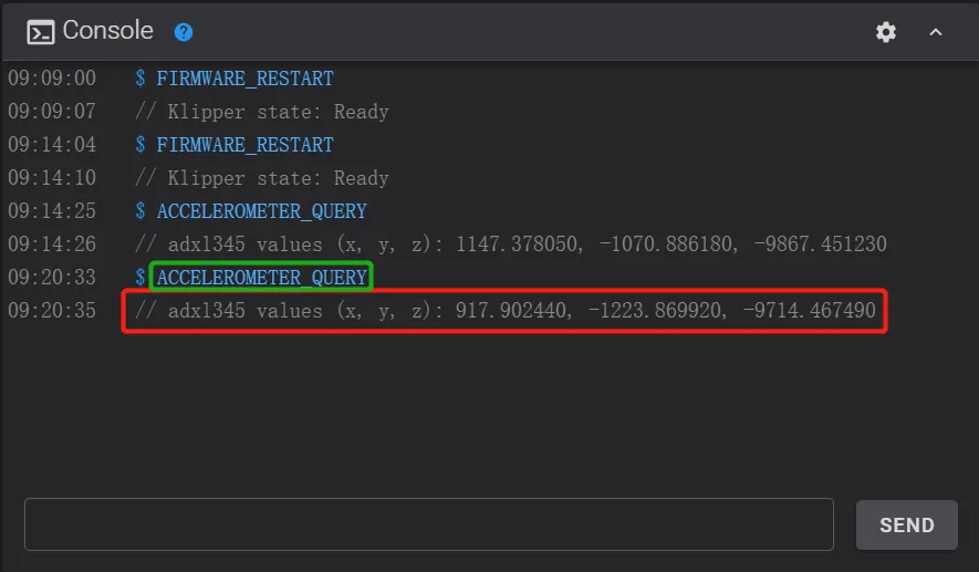 ACCELEROMETER_QUERY CHIP=<ADXL>其中<ADXL>需要修改成对应的加速度计名字 - 如果出现报错请检查接线及配置
