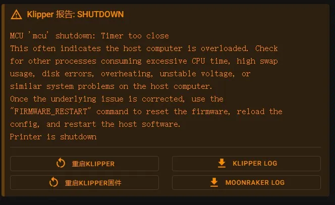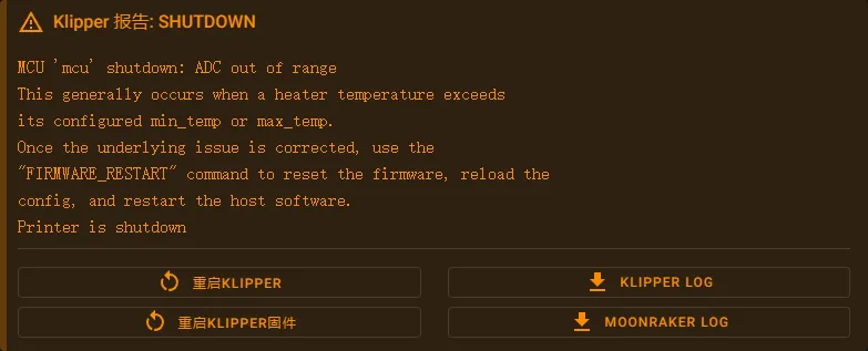 • Klipper 检测到温度超过最大或最小阀值(热敏电阻可能开路或者短路),系统将进入关闭保护模式。