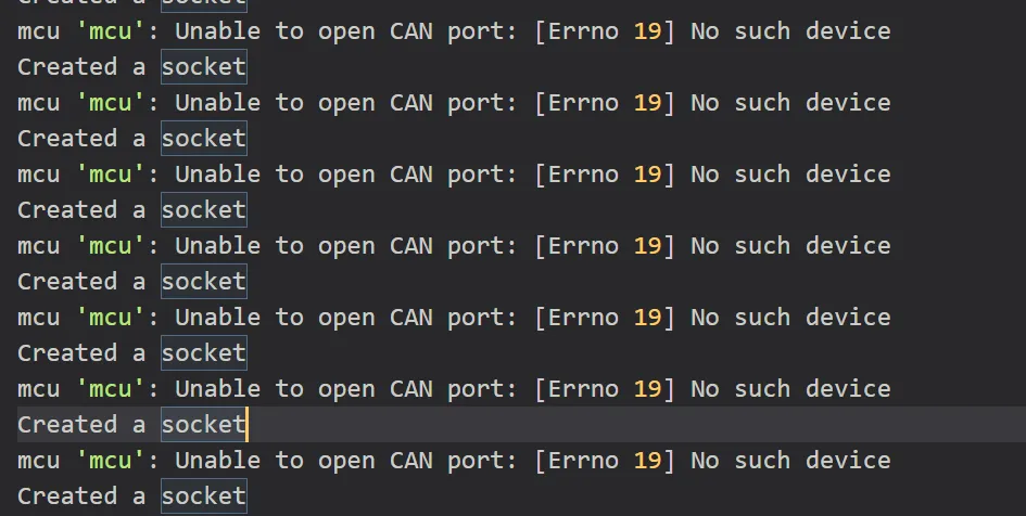 • 出现mcu 'mcu': Unable to open CAN port: Failed to transmit: [Errno 100] Network is down代表CAN网络没配置或者CAN0没启动