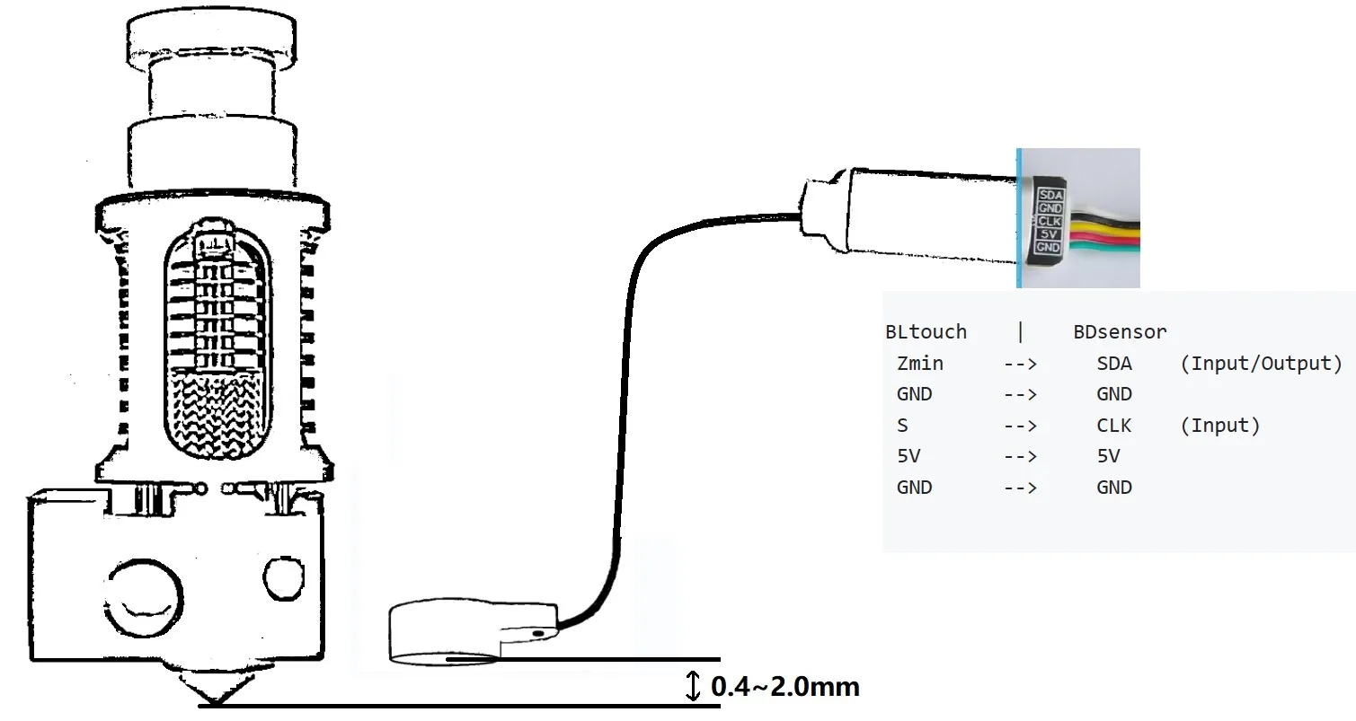 • BDsensor的CKL和SDA线可以连接到电路板的任何GPIO引脚。您也可以将BD传感器电缆直接连接到Bltouch端口,例如: