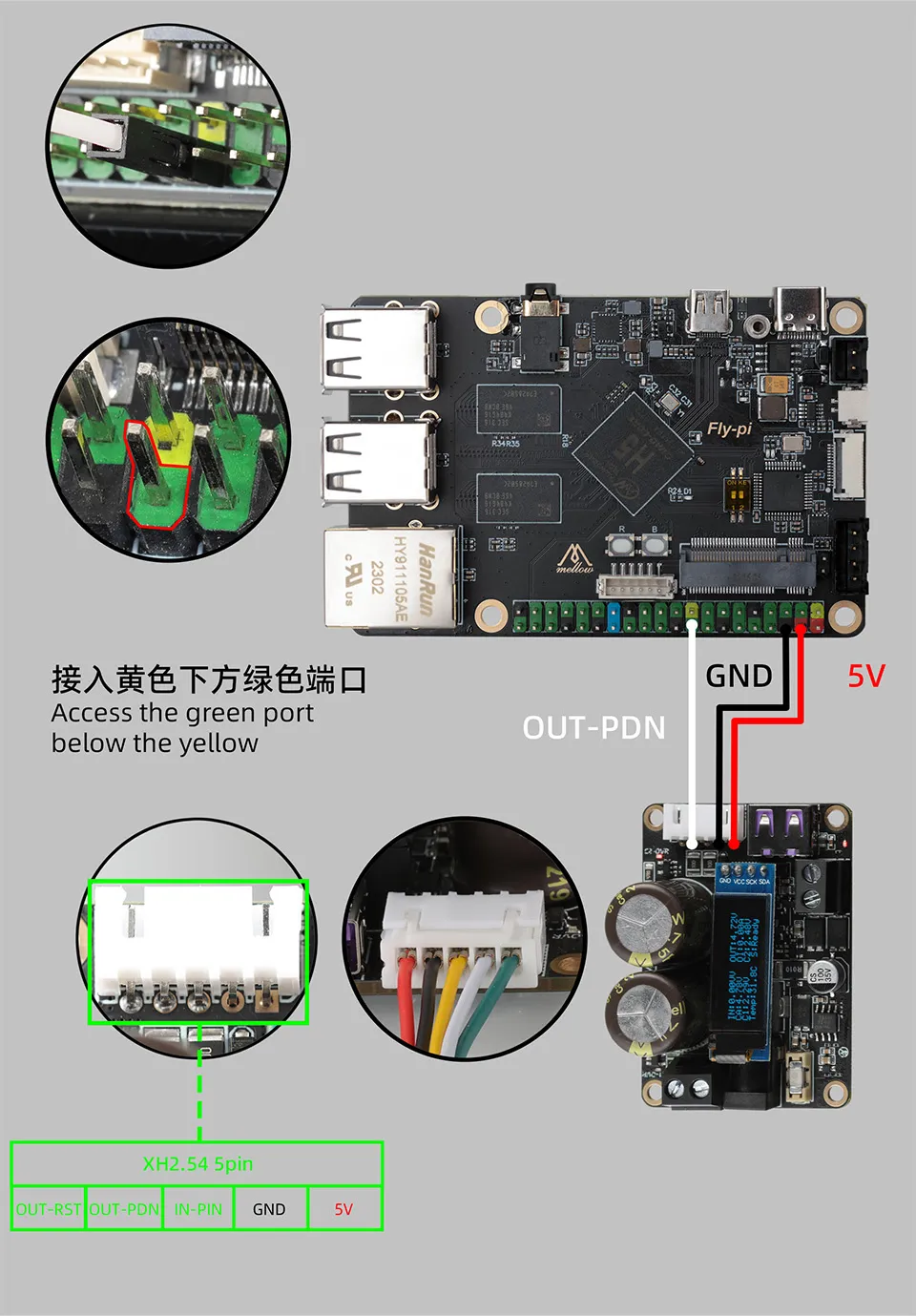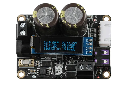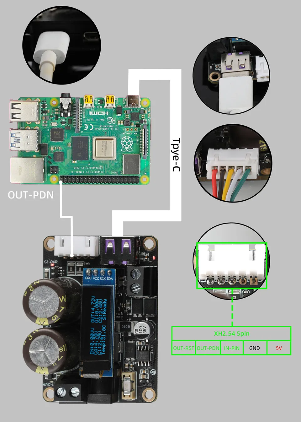 搭配安全关机模块时候,需要使用 12V-24V 电源供电,为确保模块工作正常,安全关机模块板内 5V 输出电压不能低于 4.9V,否则 安全关机模块 会从内部升压取电,电容会一直处于充电状态,导致模块持续发热