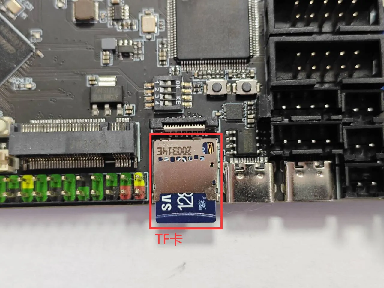 - 在将系统烧录到TF卡后,需要将TF卡接到C8此处,否则系统无法启动