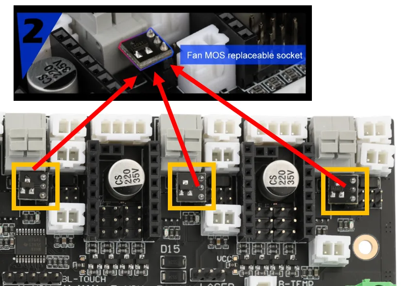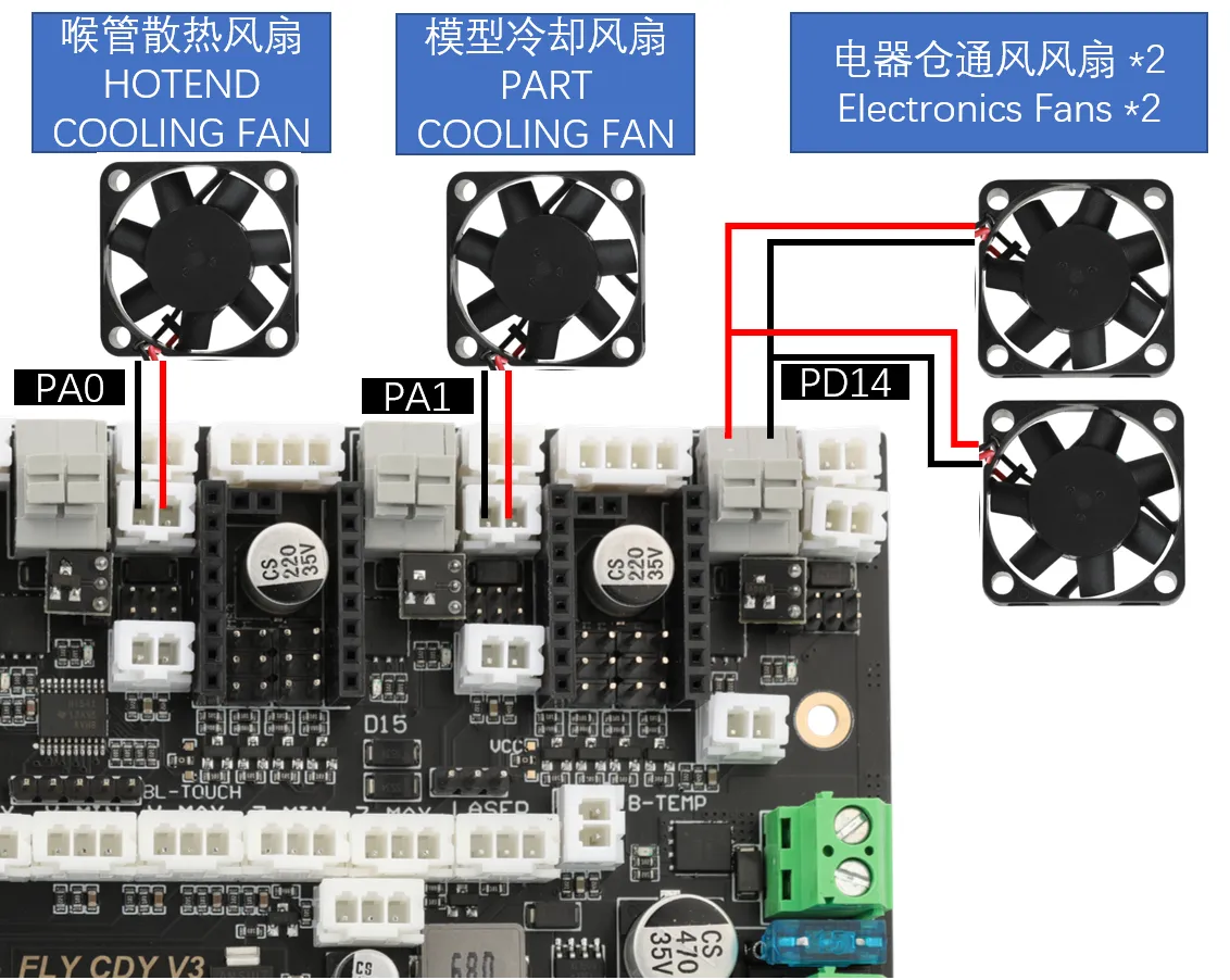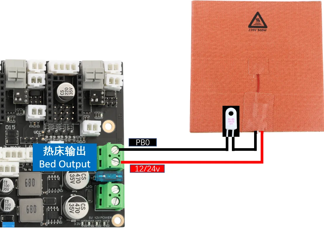 • 直流热床: 板载MOS接直流热床时请注意使用功率,直流热床最大电流不能超过10A。如果超过10A,建议使用外接MOS模块来使用热床,否则可能会对主板造成不可逆的损伤。
