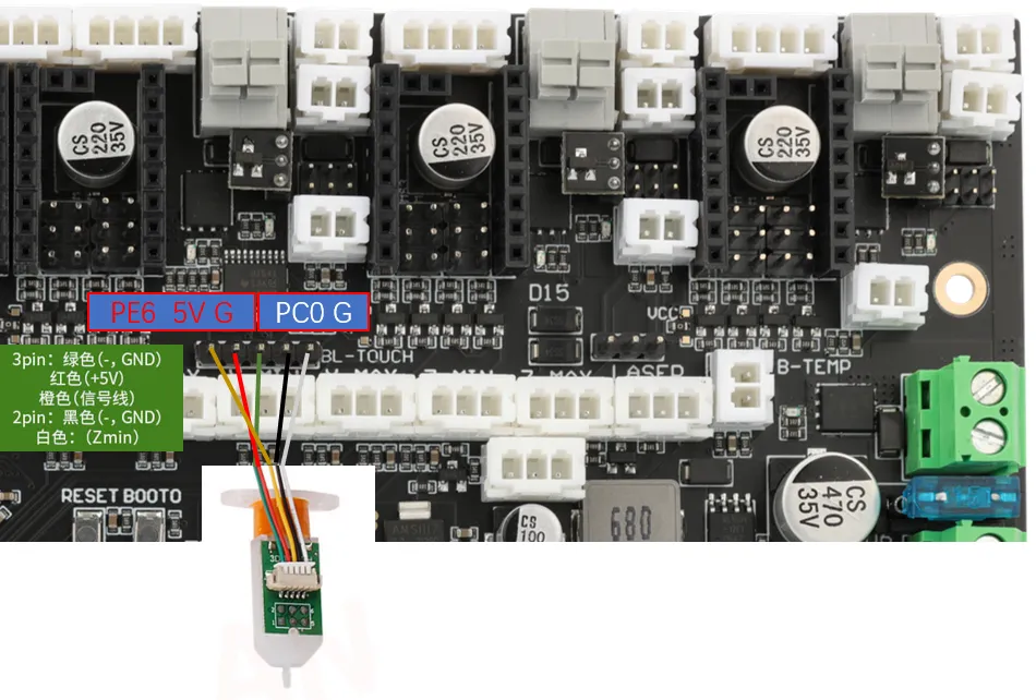 • Klicky为第三方的调平传感器,能够用极低的成本自己在家制作,且性能稳定,性价比高,推荐使用。接线方法如下图所示。