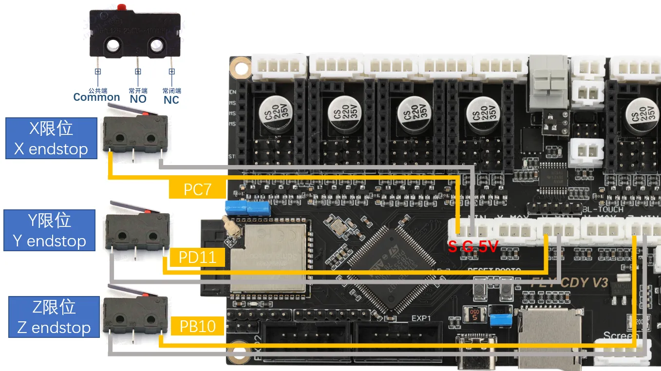 • 限位开关有常开(NO)和常闭(NC)两种。一般在3D打印机上,建议使用常闭(NC),这样在限位开关线路出现问题时,系统会及时报错,可以避免一些不必要的撞车,避免损坏打印机。