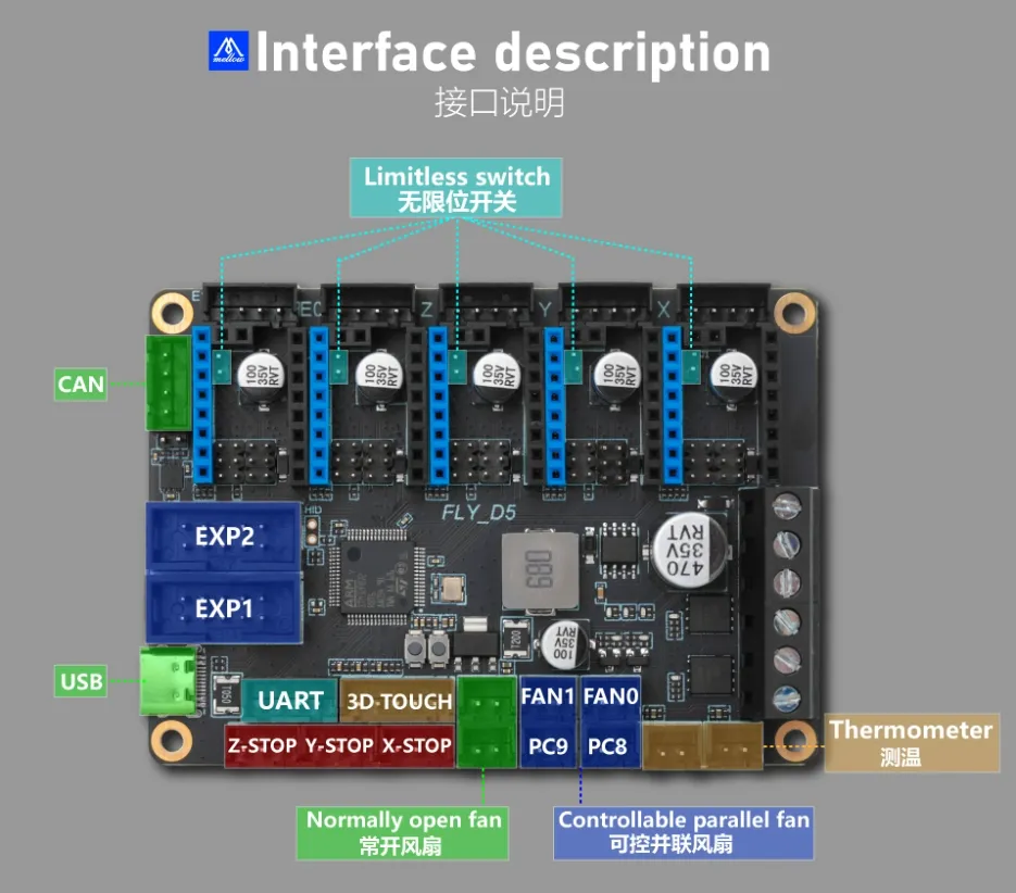直流热床: 板载MOS接直流热床时请注意使用功率,直流热床最大电流不能超过10A。如果超过10A,建议使用外接MOS模块来使用热床,否则可能会对主板造成不可逆的损伤。