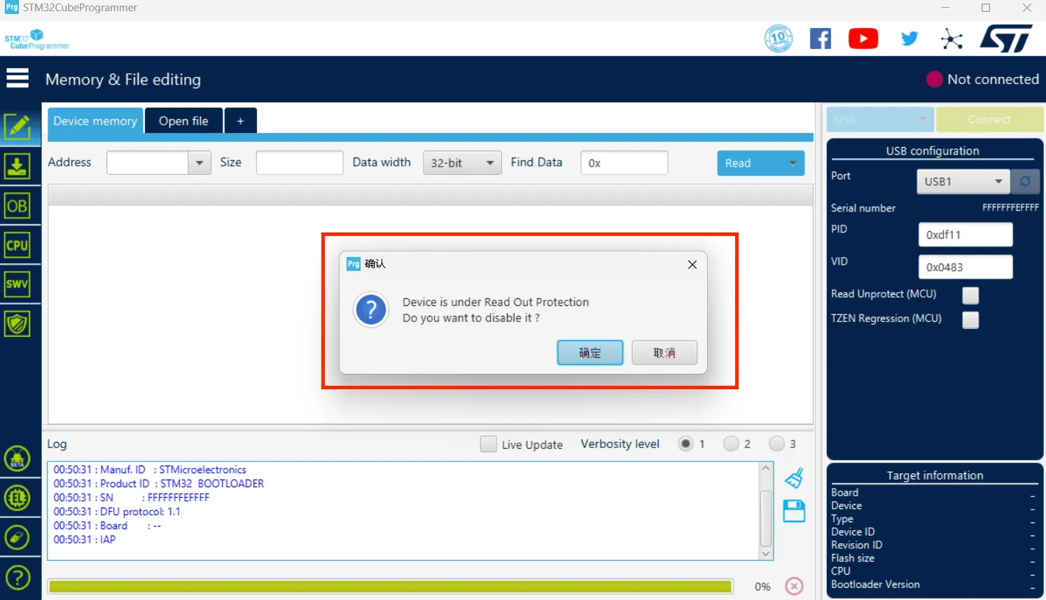 5. STM32CubeProgrammer中选择USB模式,并刷新,连接