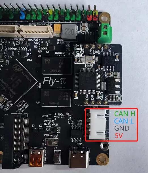 上位机类FLY-Pi板载CAN HAT使用本页总览板载CAN HAT使用 请注意CAN HAT已经停产 安装模块 安装模块后将占用一个USB口 提示安装模块后,下图所示的USB口会被占用,不能再接入任何设备!!!