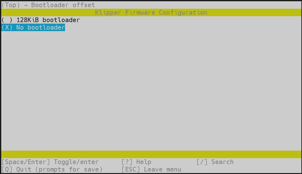ESC,用于返回上一级菜单 Q键,用于退出Klipper固件配置页面Y键,在退出Klipper固件配置页面时,如果有提示,则点击Y键保存配置文件