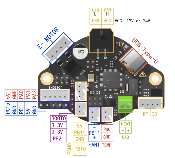 FLY SHT36/42是广州镁伦电子科技有限公司针对3D打印机挤出头设计的喷头工具板,使用该工具板,可以用四根线来替代原来主板与打印头之间繁杂的接线,优化布局。SHT36适用于36步进电机,SHT42适用于42步进电机,其集成了CAN收发器、USB口、TMC2209驱动、ADXL345加速度传感器,两个可控风扇等其他功能的工具板。此工具板适用于Klipper固件。