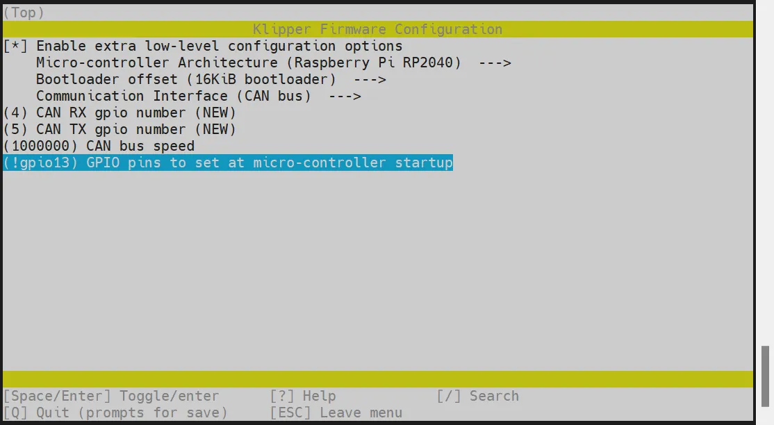 ESC,用于返回上一级菜单 Q键,用于退出Klipper固件配置页面Y键,在退出Klipper固件配置页面时,如果有提示,则点击Y键保存配置文件