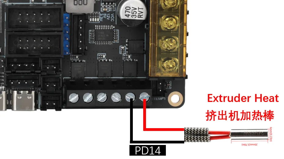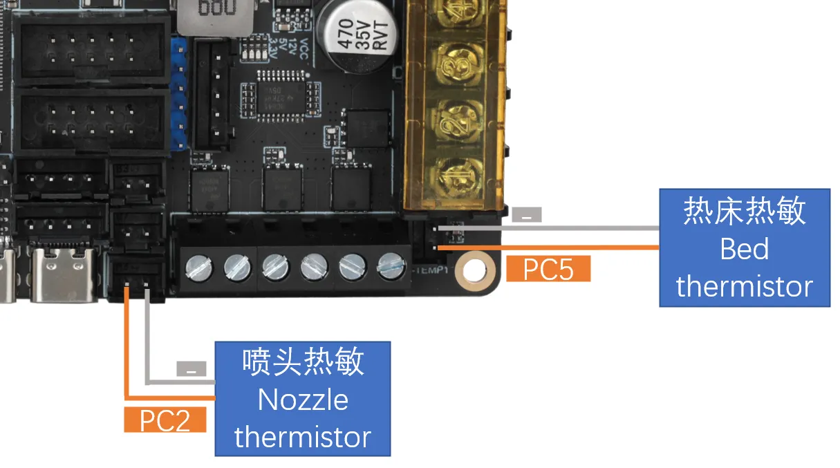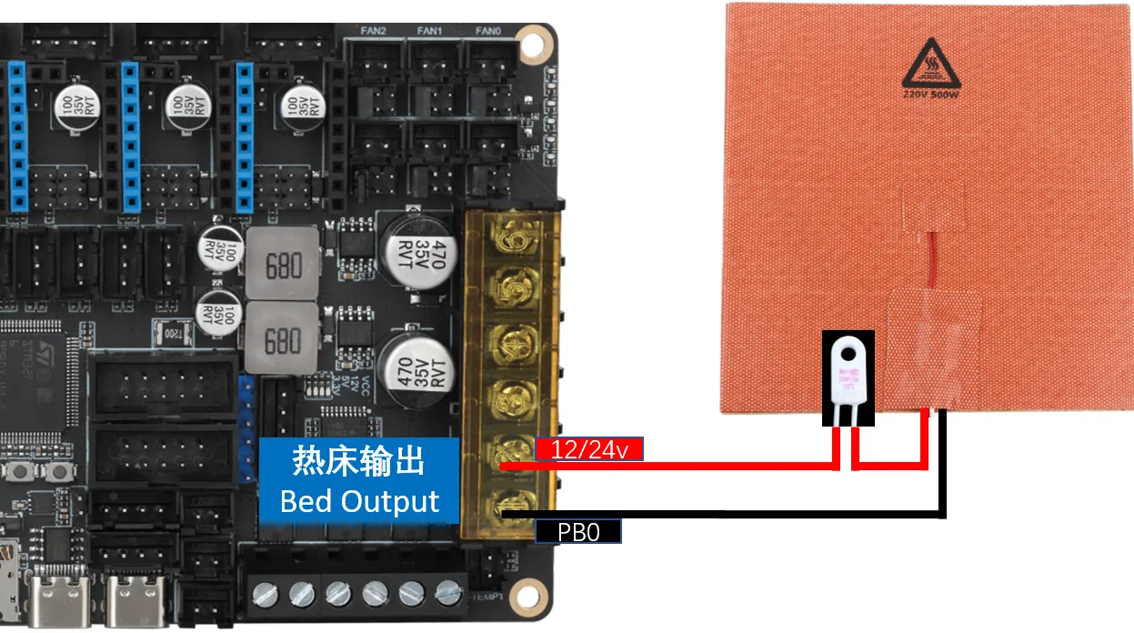 DC Bed: When connecting the onboard MOS to a DC bed, pay attention to the power usage. The maximum current for a DC bed cannot exceed 10A. If the current exceeds 10A, it is recommended to use an external MOS module to use the bed, otherwise, it may cause irreversible damage to the motherboard.