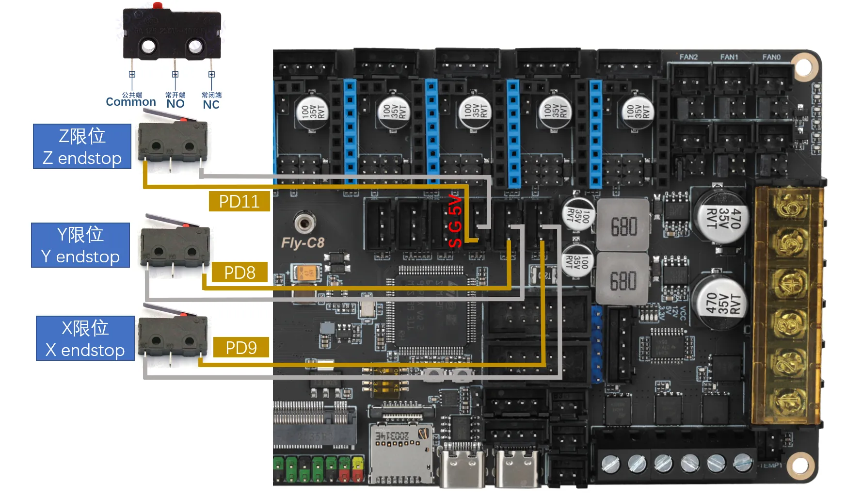 Limit switches come in Normally Open (NO) and Normally Closed (NC) types. Generally, in a 3D printer, it is recommended to use NC. This way, if there is an issue with the limit switch circuit, the system will promptly report an error, preventing unnecessary crashes and damage to the printer.
