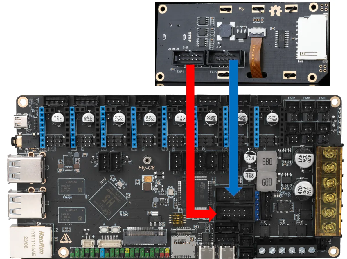 The wiring method for FLY's mini12864 is shown below. For screens from other manufacturers, please consult the respective manufacturer. Reversing or misconnecting a Mini12864 screen may result in the host computer being unable to connect to the MCU. If you previously could connect the MCU normally with the motherboard, but after using the mini12864, you cannot connect to the MCU, try unplugging the mini12864 wiring!!