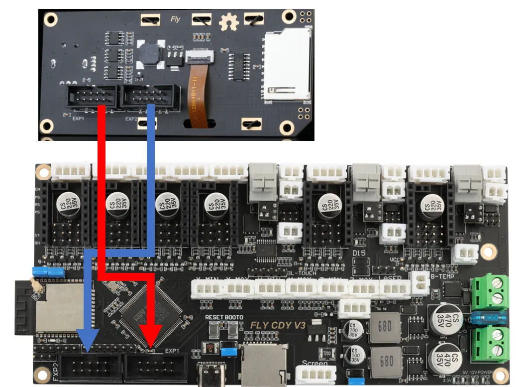 The following diagram shows the wiring method for FLY's mini12864. For other manufacturers' screens, please consult the respective manufacturer. If the Mini12864 screen is wired incorrectly, it may cause the host computer to lose connection with the MCU. If you previously could connect to the motherboard's MCU normally but cannot after using the Mini12864, try unplugging the Mini12864 wiring!!!