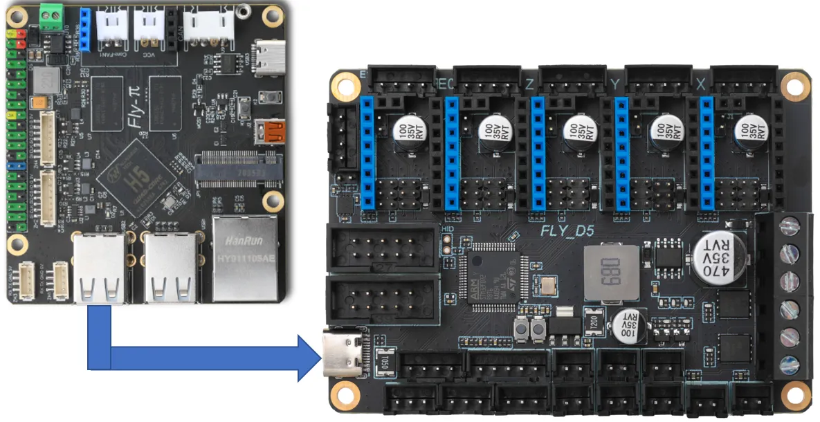 The motherboard connects to the host computer's USB port through a Type-C interface, or it can be connected via serial port. Only the former is described here.