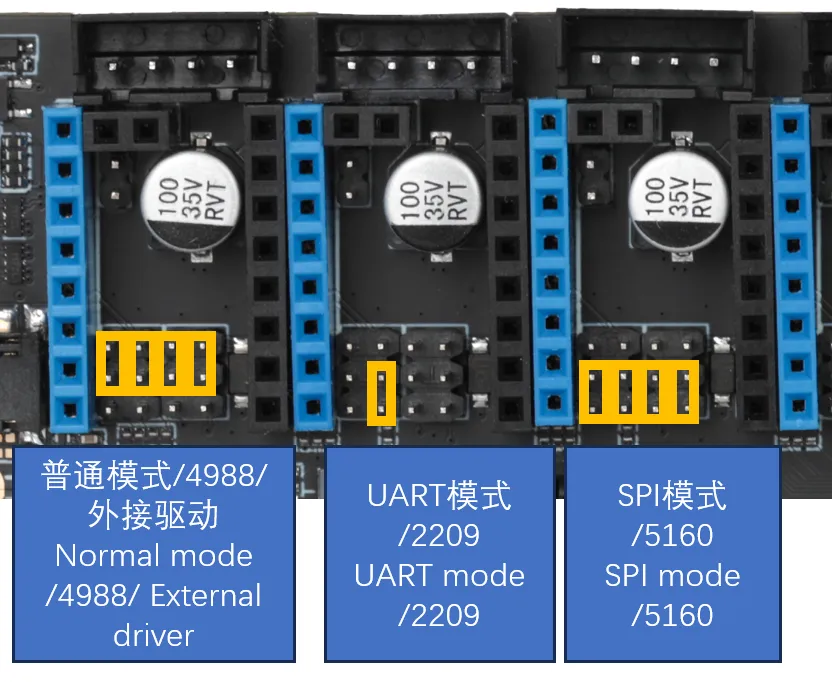 STEP/DIR Mode. In this mode, the subdivision is set using a jumper cap and the current is adjusted by a potentiometer. The most common driver used is the A4988 driver. For drivers like this, you need to refer to the manufacturer's subdivision configuration table and set the subdivision using the jumper cap.