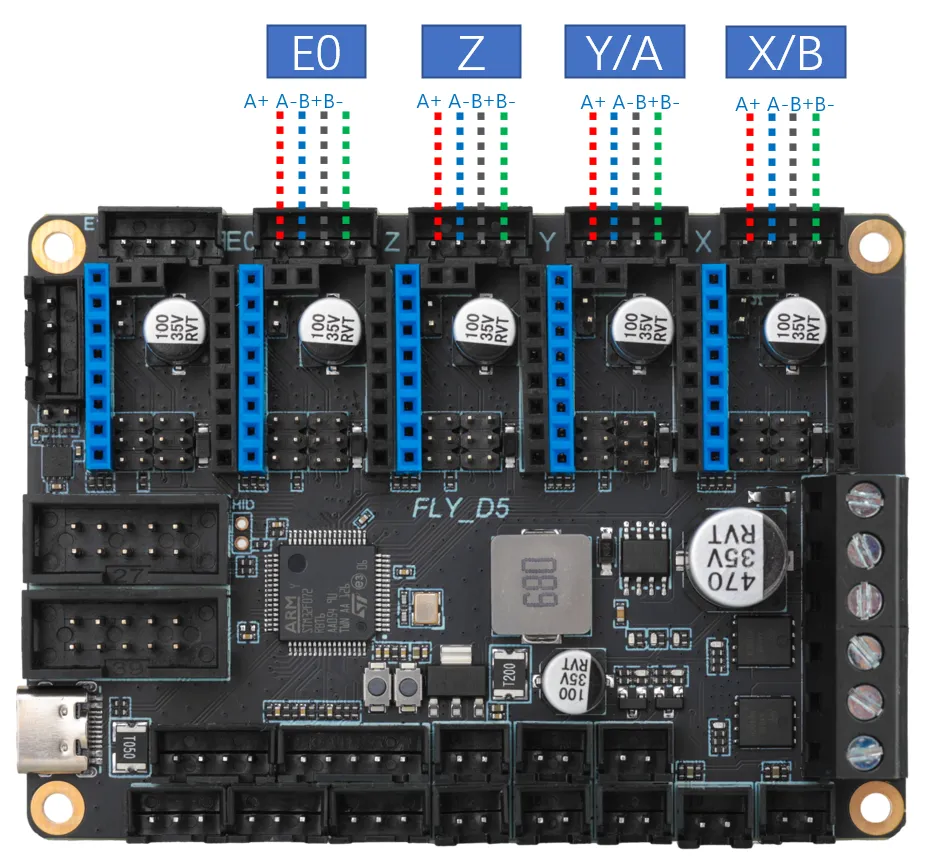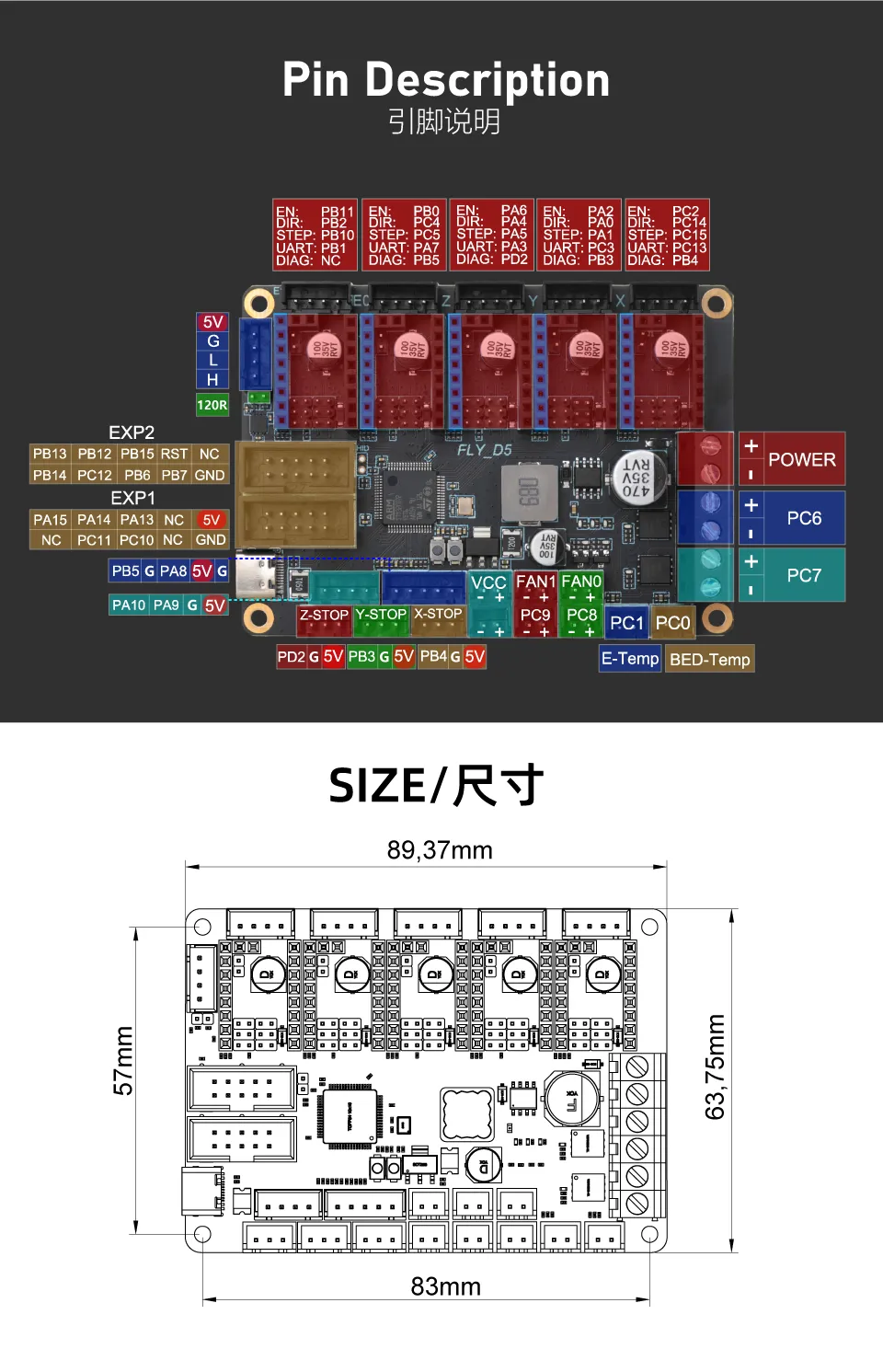 DC Bed: When connecting a DC bed to the onboard MOS, pay attention to the power usage. The maximum current for a DC bed cannot exceed 10A. If the current exceeds 10A, it is recommended to use an external MOS module to connect the bed to avoid irreversible damage to the motherboard.