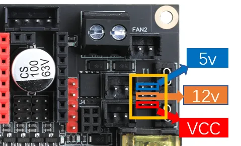 Fan voltage selection. Short the corresponding voltage pins with a jumper cap. The selection method is as shown in the figure. Note: The jumper configurations in the yellow box are the same. Note!!!! Incorrect fan voltage selection may damage the fan or MOS module.