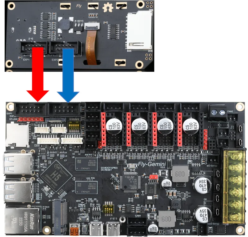 • The diagram below shows the wiring method for the FLY mini12864. For other manufacturers' screens, please consult the respective manufacturers. Reversing or incorrectly connecting the Mini12864 screen may cause the host computer to lose connection with the MCU. If the Mini12864 screen worked fine before but now fails to connect to the MCU, try unplugging the Mini12864 wiring!!!