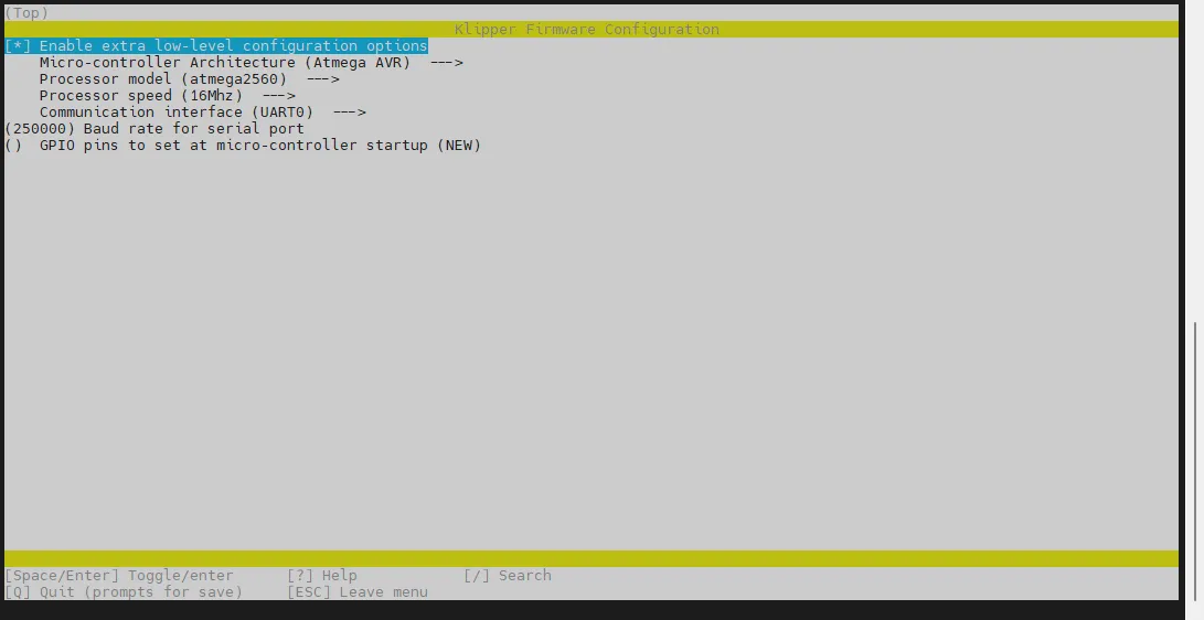 cd ~/klipper && rm -rf ~/klipper/.config && rm -rf ~/klipper/out && make menuconfig -