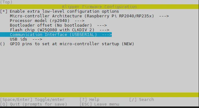 rm -rf ~/klipper/.config && rm -rf ~/klipper/outis to delete previous compilation data and firmware.make menuconfigis for compiling the firmware, after which the following interface should appear: