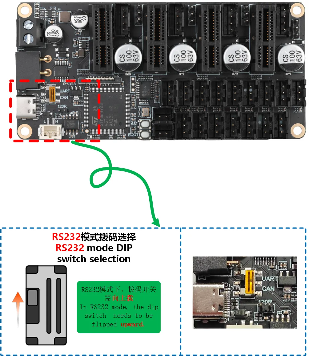 Tool BoardFLY-MMUFLY-MMUCompilation and programming of MMU firmwareOn-board DIP Switch IntroductionOn this pageOn-board DIP Switch Introduction RS232 Mode CAN Mode