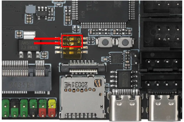 • Déplacez les commutateurs DIP 1 et 2 vers la gauche, sinon cela affectera la connexion entre le dispositif inférieur et l'hôte.