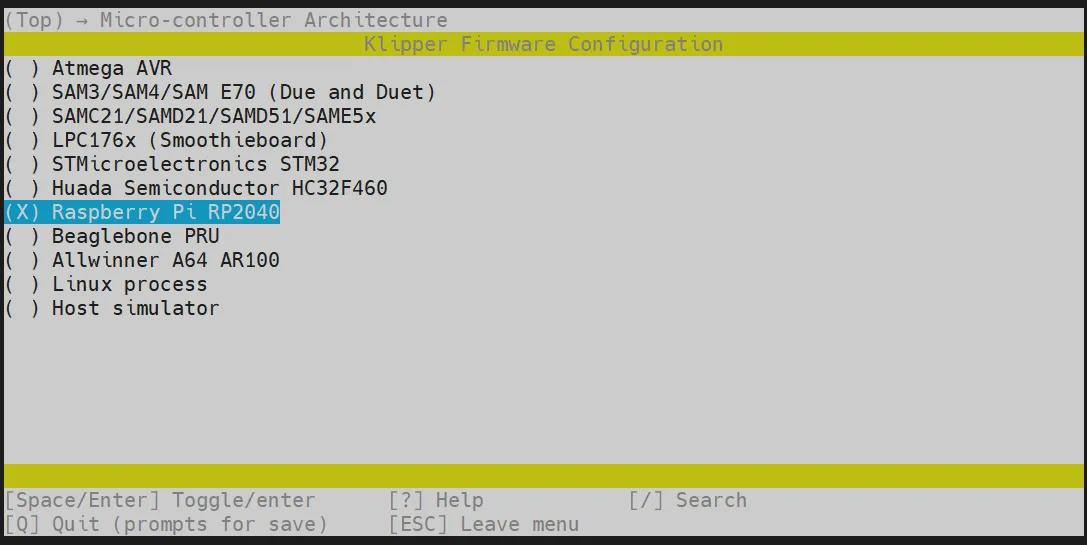 cd ~/klipper && rm -rf ~/klipper/.config && rm -rf ~/klipper/out && make menuconfig -