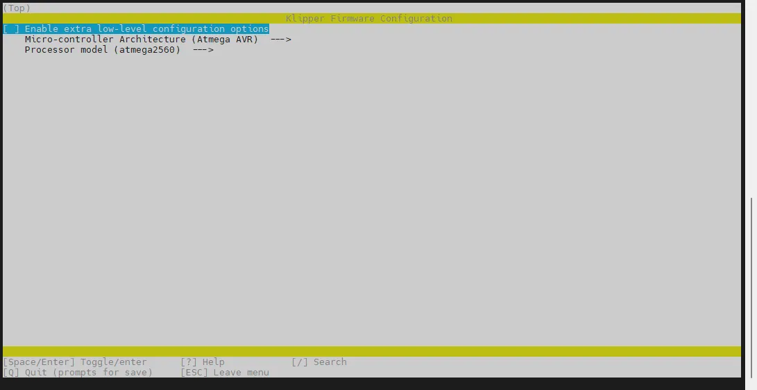 rm -rf ~/klipper/.config && rm -rf ~/klipper/outsupprime les données et le firmware précédemment compilés, tandis quemake menuconfigcompile le firmware. Après exécution, vous devriez voir l'écran ci-dessous :