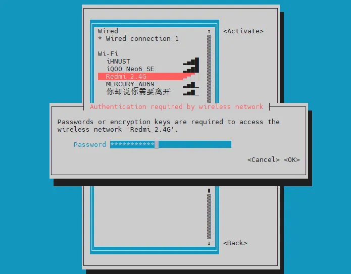 • Vous serez dirigé vers l'interface suivante, utilisez les touches ↑ ↓ du clavier pour choisir le WiFi auquel vous souhaitez vous connecter, appuyez sur Entrée, entrez le mot de passe et attendez que la connexion soit établie