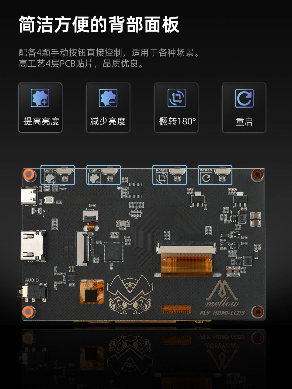 Cet appareil utilise un port unique de circuit imprimé flexible (FPC) qui peut être directement connecté à la carte mère principale de la conception Fly, sans avoir besoin de câbles HDMI ou USB. Cette connexion FPC simplifiée réduit l'encombrement des câbles et assure une interface propre et efficace. Bien que cette méthode de connexion avancée soit employée, l'appareil conserve également un port HDMI standard pour ceux qui préfèrent les options de connexion traditionnelles. En plus de la connectivité flexible, l'appareil comprend des touches de fonction intelligentes pour ajuster facilement la luminosité, faire pivoter l'écran et redémarrer. Un adhésif en mousse de haute qualité importé garantit une adhérence forte de l'écran et une excellente durabilité. La technologie de dissipation thermique à faible résistance des deux côtés améliore la sensibilité au toucher, offrant une expérience utilisateur plus fluide. La technologie de la lumière jaune fournit une restitution précise des couleurs avec une luminosité standard de 500, évitant la surexposition. L'écran est protégé par du verre trempé de haute résistance, assurant une protection robuste contre les dommages. Cet appareil est entièrement compatible avec des systèmes hôtes comme Raspberry Pi et utilise un design de port HDMI caché, les câbles étant soigneusement dissimulés à l'arrière de l'appareil pour un aspect propre et professionnel. Son design de circuit haute performance garantit un fonctionnement sans faille, ce qui en fait le choix idéal pour une imprimante 3D performante et fiable.