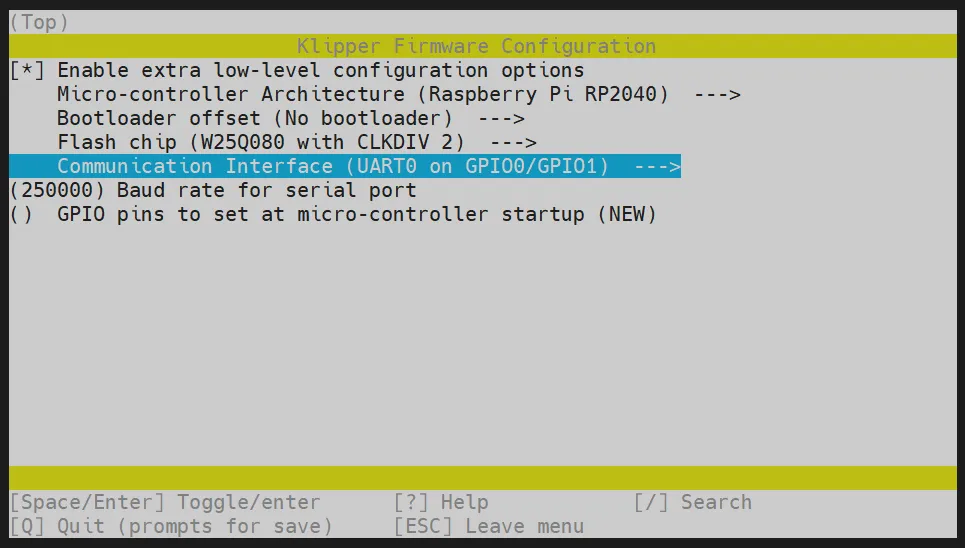 cd ~/klipper && rm -rf ~/klipper/.config && rm -rf ~/klipper/out && make menuconfig -