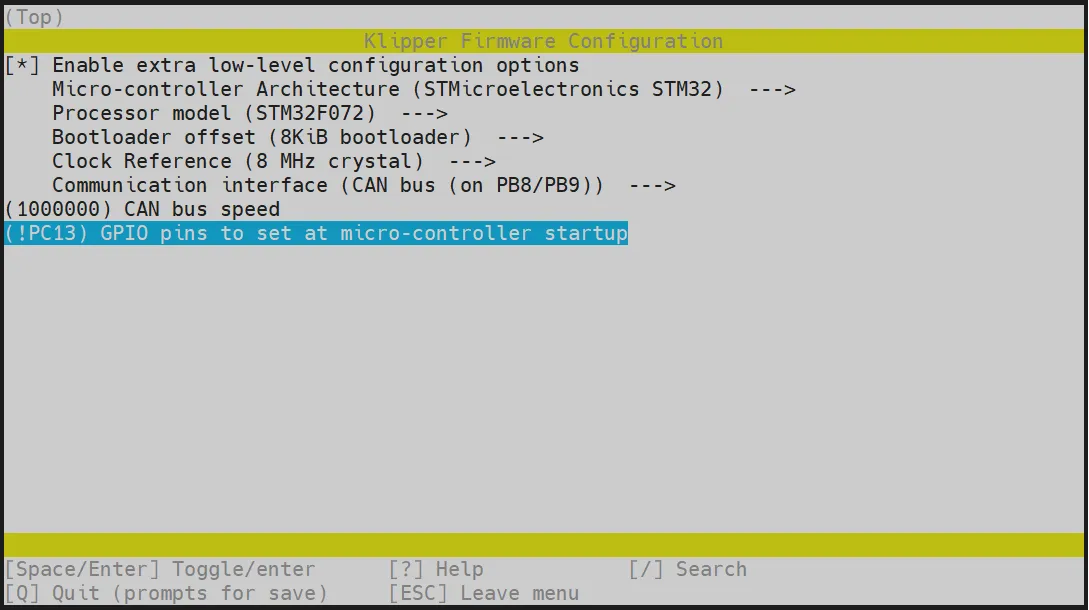 ESC,用于返回上一级菜单 Q键,用于退出Klipper固件配置页面Y键,在退出Klipper固件配置页面时,如果有提示,则点击Y键保存配置文件