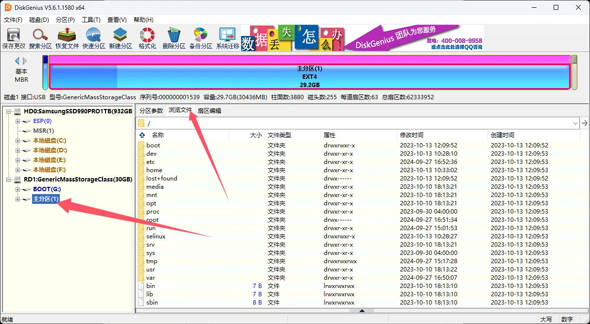 - 左側のメインパーティションをクリックし、上部の「ファイルを閲覧」をクリックすると、下部にファイルが表示されます