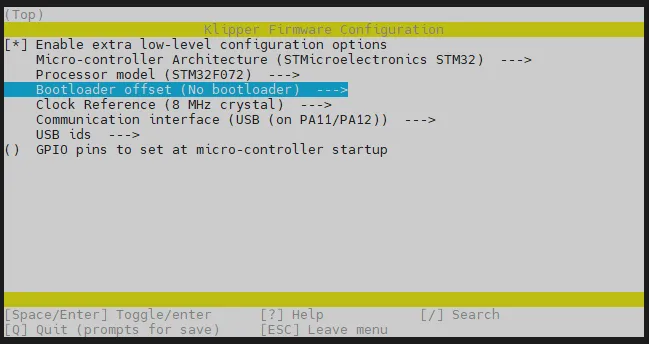 cd ~/klipper && rm -rf ~/klipper/.config && rm -rf ~/klipper/out && make menuconfig -
