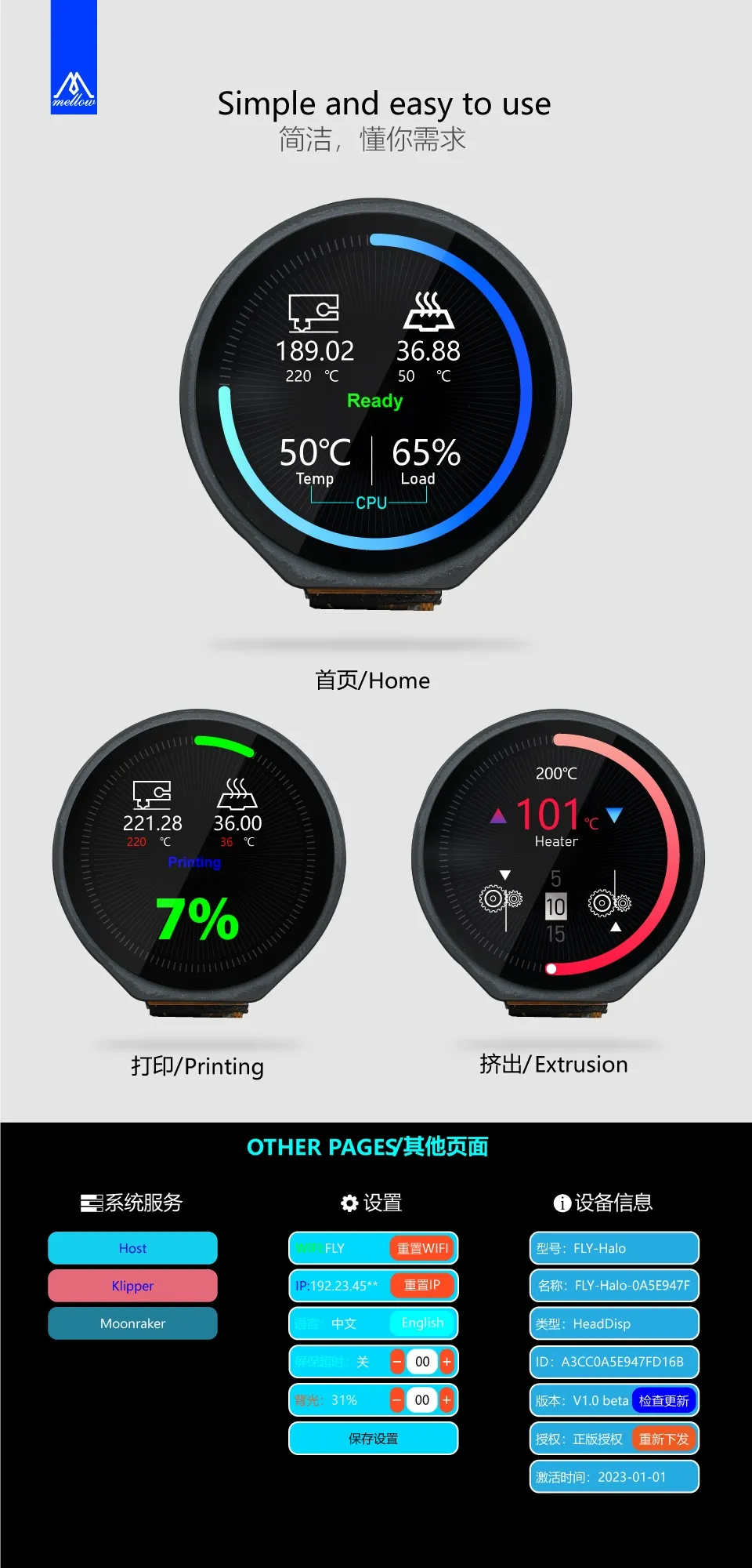 設定(haloの各種パラメータ、Wi-Fi、IP、言語、バックライトの明るさなどの設定用)