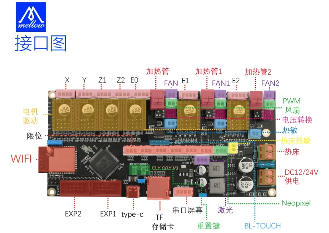 • 直流ヒートベッド: マザーボードに搭載されているMOSで直流ヒートベッドに接続する際には、電力の使用に注意してください。直流ヒートベッドの最大電流は10Aを超えてはいけません。10Aを超える場合は、外部MOSモジュールを使用してヒートベッドを使用することをお勧めします。そうしないとマザーボードに取り返しのつかないダメージを与える可能性があります。
