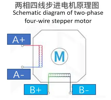 • 3Dプリンタで最も一般的なのは2相4線ステッピングモーターで、その原理は以下の図の通りです。ステッピングモーターの線順を識別する方法は2つあります: