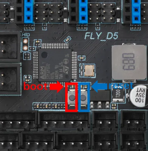 - 第二の方法:データ転送可能なケーブルを主板とデバイスに接続した後、BOOTボタンを押しながらRESETボタンを押し、RESETボタンを離してからBOOTボタンを離します