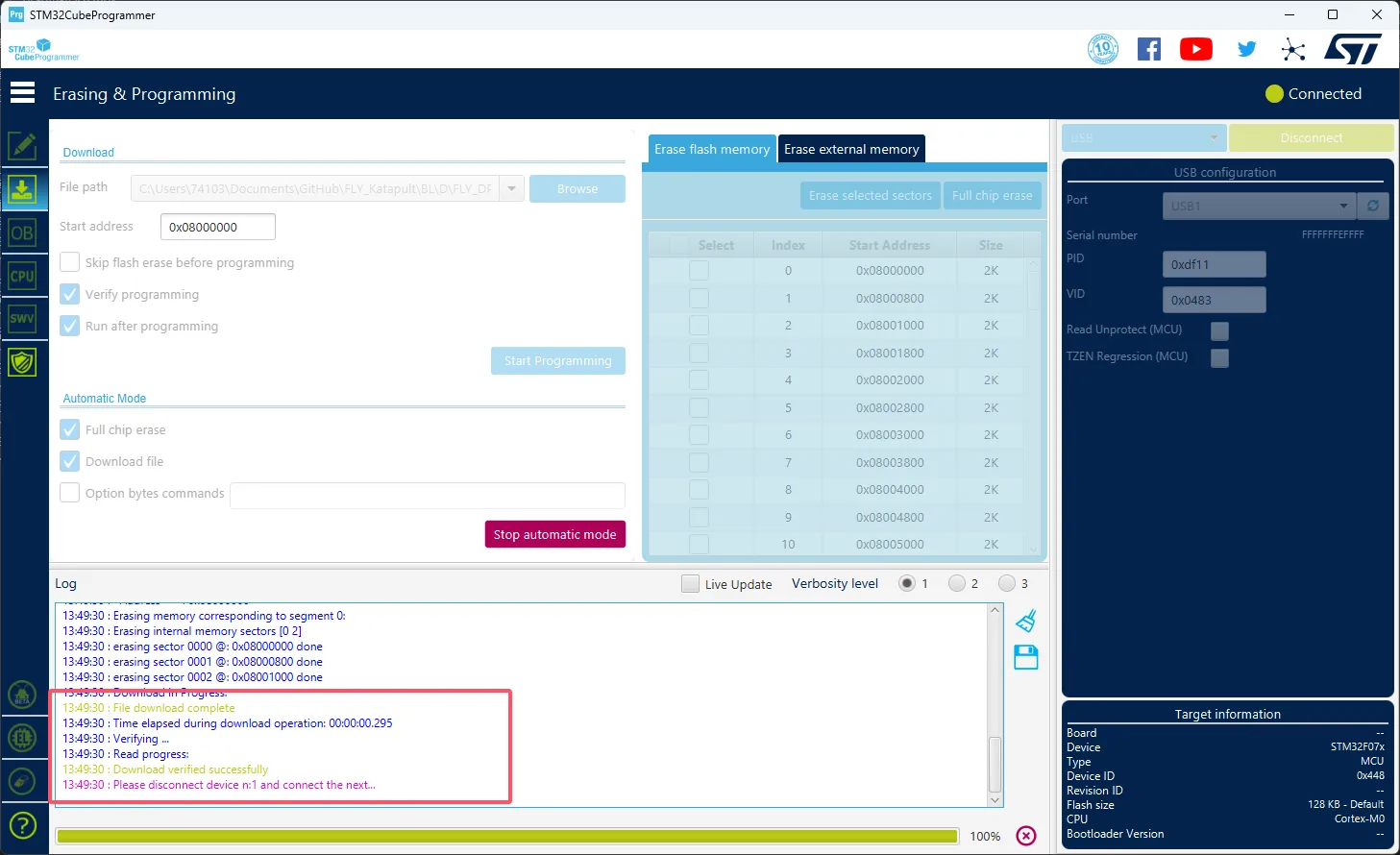 Start automatic modeをクリックしてファームウェアの書き込みを開始します