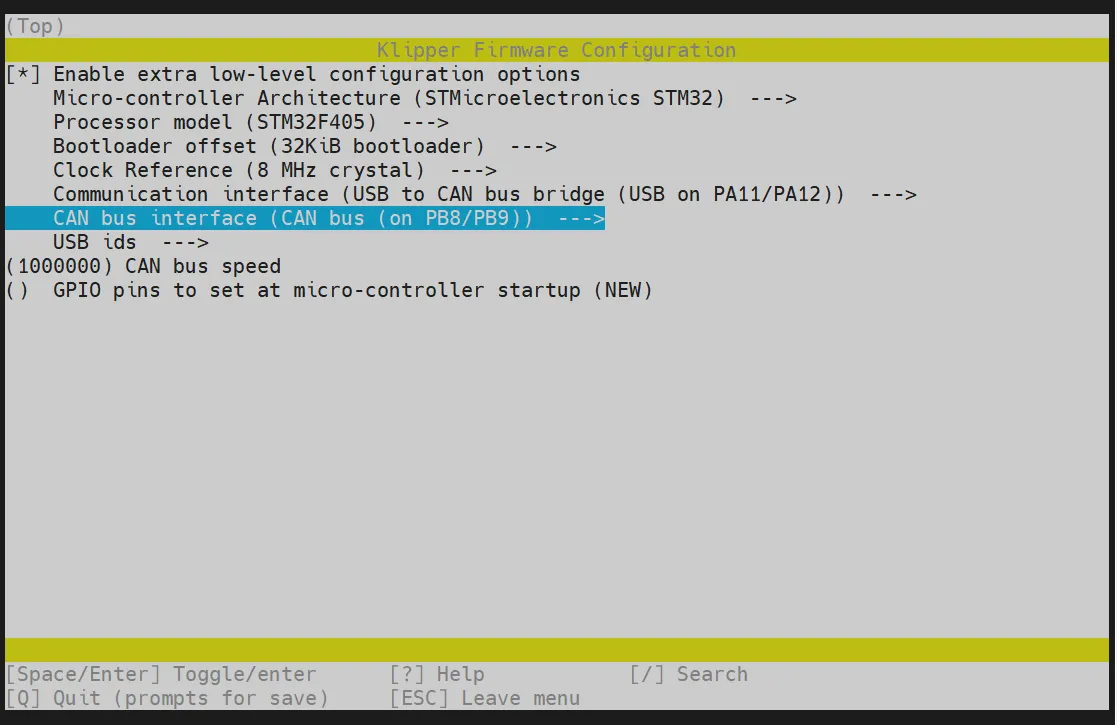 cd ~/klipper && rm -rf ~/klipper/.config && rm -rf ~/klipper/out && make menuconfig -