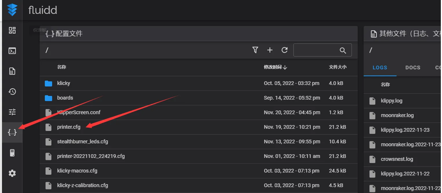 {…}、Mainsailは機械で、クリックするとprinter.cfgが見つかります
