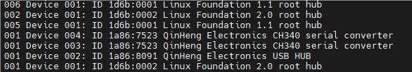 lsusbを入力してデバイスを検索できます。以下のいずれかの状況が起こりますlsusbを入力するとlsコマンドが見つからないと表示される場合、下記のコマンドを入力してインストールしてくださいsudo apt-get install usbutilslsusbを入力しても何も反応しない場合は、システムの問題で何もできません。システムを変更するか、正常なシステムを使用してください- 下の画像のような情報が表示されますが、これは参考のため注意してください。IDの後ろの文字を確認するだけです