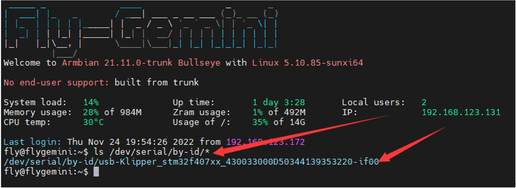 printer.cfg設定ファイルの[mcu]ノードのserial:に記入します。保存して再起動するとメインボードに接続できます。KlipperがADC out of rangeと表示するのは正常な現象です。ヒートベッドと温度センサーを接続し、ノズルとヒートベッドの温度センサーと出力ピンを設定して保存し、再起動してください。