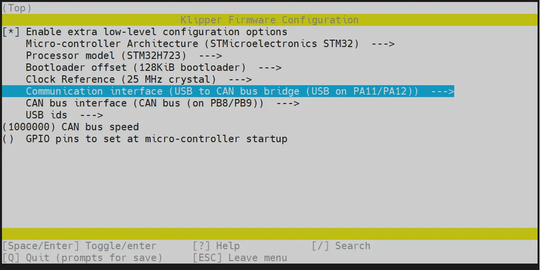 cd ~/klipper && rm -rf ~/klipper/.config && rm -rf ~/klipper/out && make menuconfig -