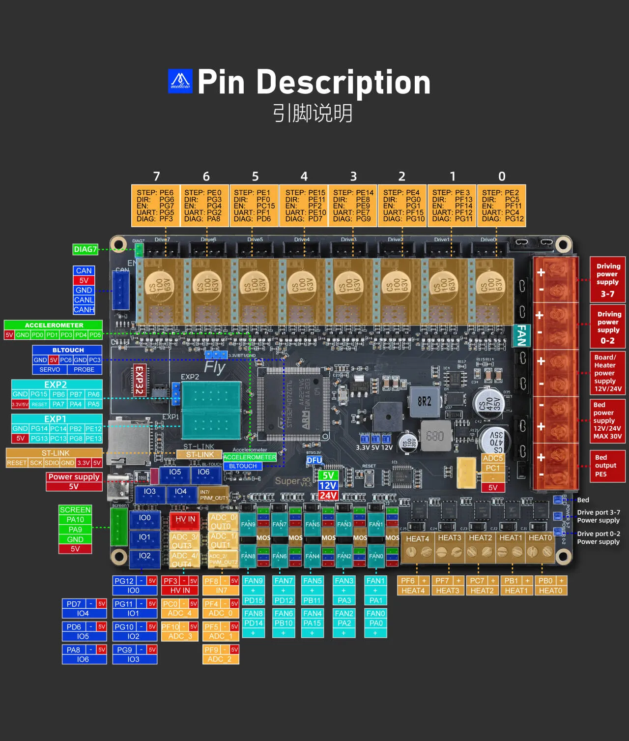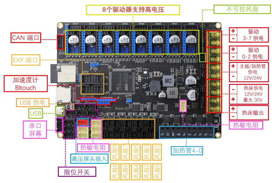 マザーボードクラスFLY-Superシリーズマザーボードフライ-スーパー8プロマザーボードの接続このページの見出しマザーボードの接続 インターフェース図 インターフェース説明 ピンの説明 マザーボードの接続 注意点画像の解像度が高すぎるため、ウェブページで閲覧する際は、接続図の上にマウスカーソルを置き、右クリックして「画像を保存」してからデスクトップで確認してください! 注意Super8 proのピンはsuper8と同じです。そのため、ここではsuper8の接続図をそのまま引用します。