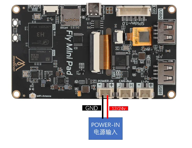 上位コンピュータクラスフライミニパッド上位機供電このページの見出し上位機供電 ヒントFLY-MINI Padの電源供給方法は3種類あります 接線方法は以下の図の通りです 12-24V電源を使用して供電 TypeCインターフェースを使用して供電 3.7Vリチウムバッテリーインターフェースを使用して供電