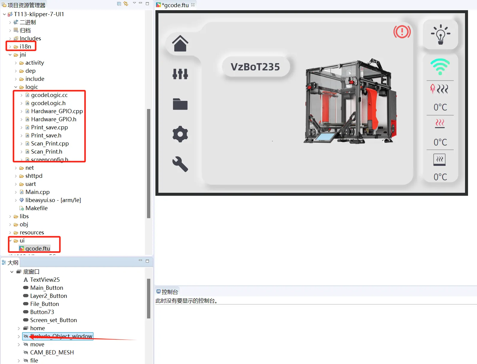 ディスプレイクラスFLY-WiScreen 7インチスクリーンカスタムスクリーンUI-プロジェクト構造の紹介このページの見出しプロジェクト構造の紹介 紹介 Logicフォルダ 私たちの99%のUIコードプログラミングはlogicフォルダ内で行われます。他のフォルダは無視してください gcodeLogic.ccはmain.cに似ており、99%のUIコードがここに存在します。他のファイルは特に注目する必要がありません i18nフォルダ 各国語の翻訳テーブルを保存 resourcesフォルダ UIで使用する画像リソースを保存 uiフォルダ UIインターフェースファイルを保存、ダブルクリックで表示 左下の矢印の指す「小さな目」をダブルクリックすると、隠れたインターフェースを開くことができます