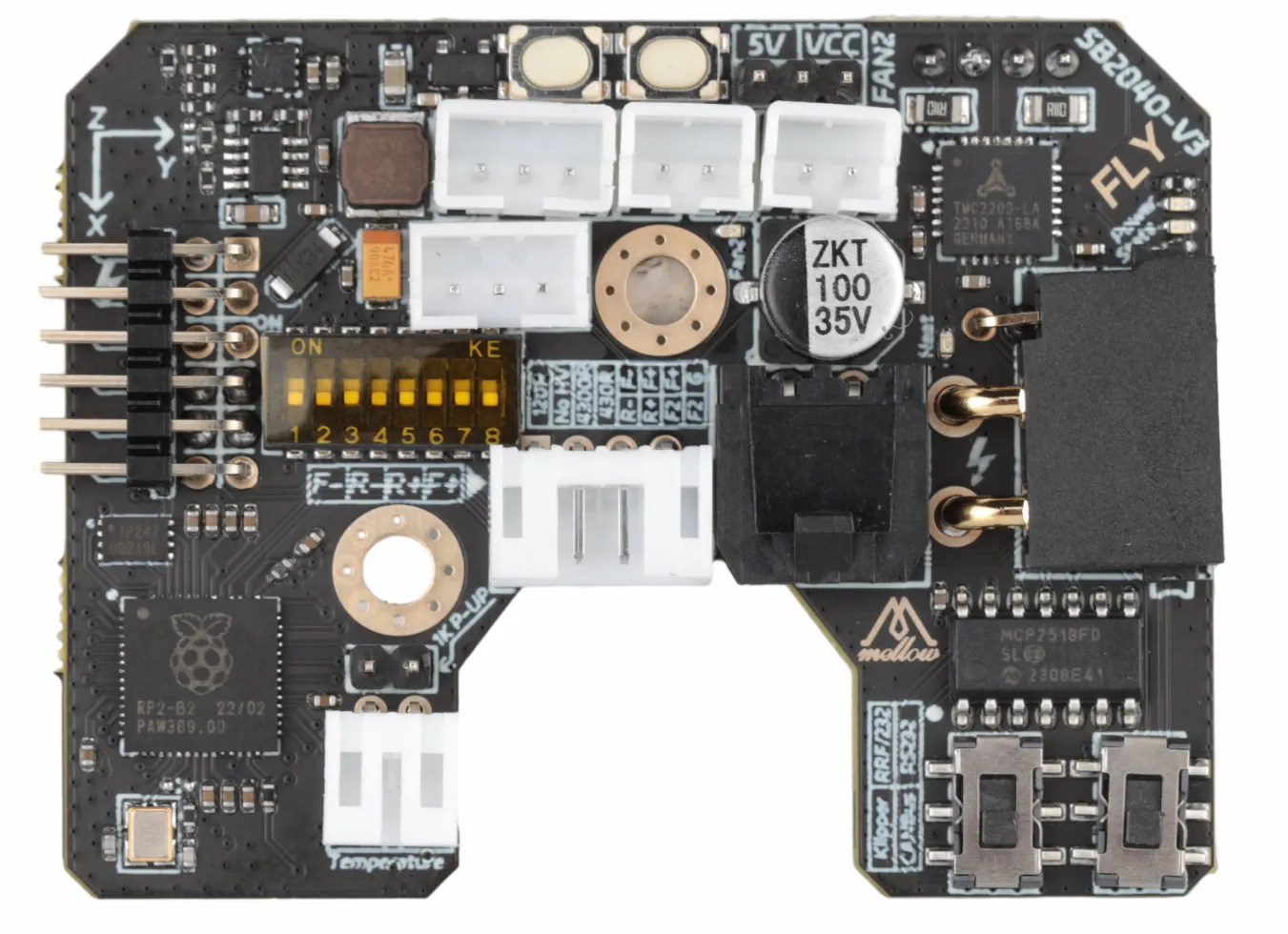 FLY SB2040 V3は、広州メロンエレクトロニクス科技有限公司がVORON Stealthburberプリントヘッド向けに開発したツールボードです。このツールボードを使用することで、プリントヘッドとメインボード間の複雑な配線を4本の線に置き換え、レイアウトを最適化できます。SB2040はstealthburnerとafterburnerに適しており、CANトランスシーバー、RS232トランスシーバー、USBポート、TMC2209ドライバー、LIS2DW加速度センサー、3つの制御可能なファンなど、他の機能も統合しています。このツールボードはKlipperおよびRRFファームウェアに対応しています。